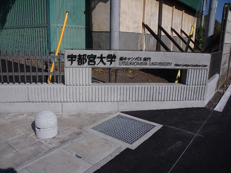 峰キャンパス南門の表札です。写真のすぐ左側に歩行者用通路が用意されています。