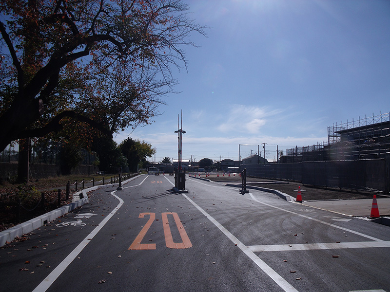 構内から南門方面を見た図。構内の制限速度は20km/hです。安全運転を心がけましょう!
