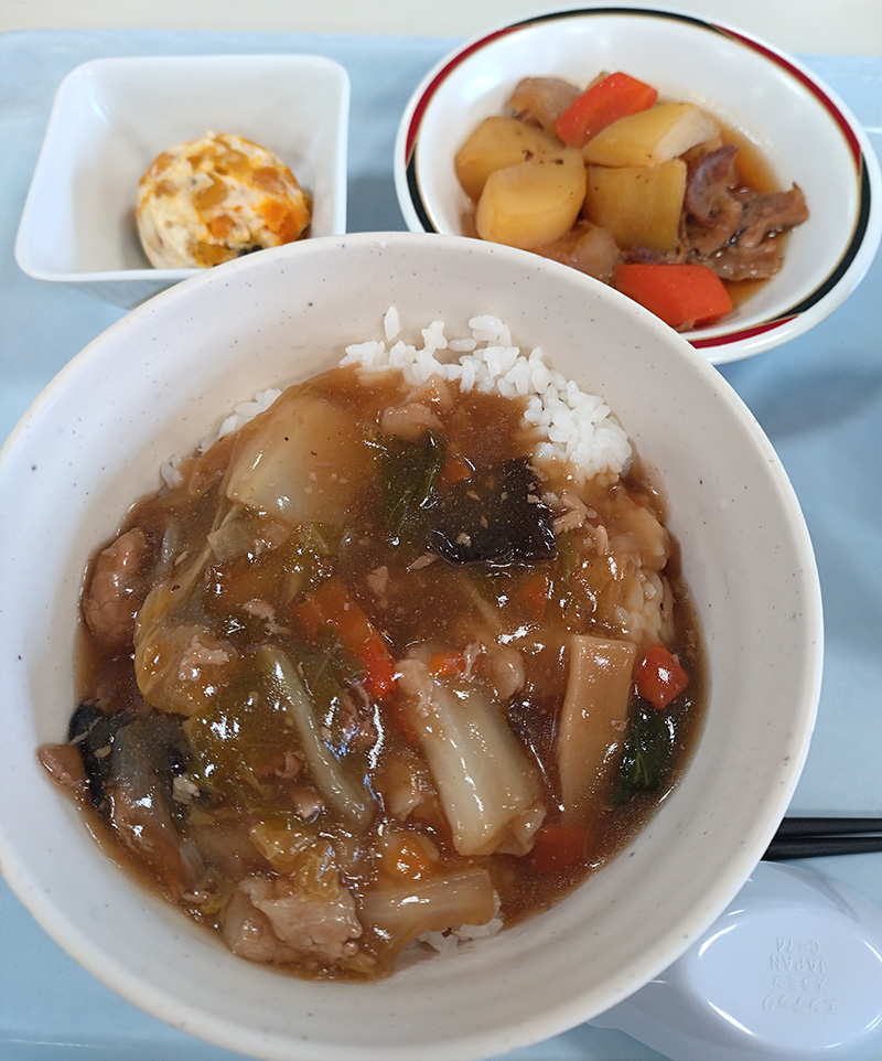 中華丼は大中小の3サイズから選べて、写真は中サイズです。餡が熱々でお野菜も取れて、ボリュームも多くて大満足の一品。肉じゃがはじゃがいもの下にもお肉がたっぷり入っていました。パンプキンサラダは甘いと思い込んでいたらマヨネーズで味付けしたおかず系でした。どれも美味しかったです❢