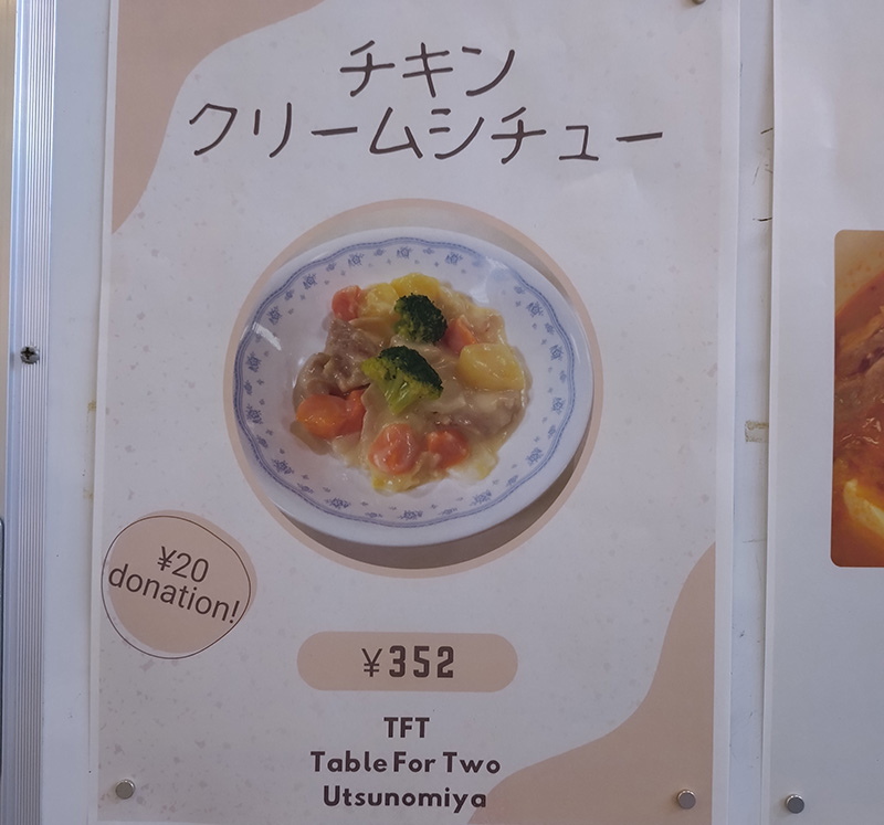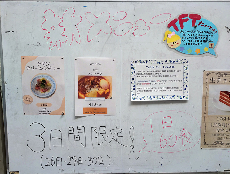 ある日の学食。ふと見ると3日間限定メニューの掲示を発見! ふむふむ・・・1食につき20円がアジア・アフリカの子供たちの給食1食分として寄付されると。 夏にも一度紹介したTable for two宇都宮とのコラボ商品の再来。もちろん注文します。(夏に紹介したメニューは、学食メニューの紹介⑨からご覧ください) チラッと見切れている生チョコケーキは大人気すぎて、提供期間中に一度もお目にかかれませんでした😿