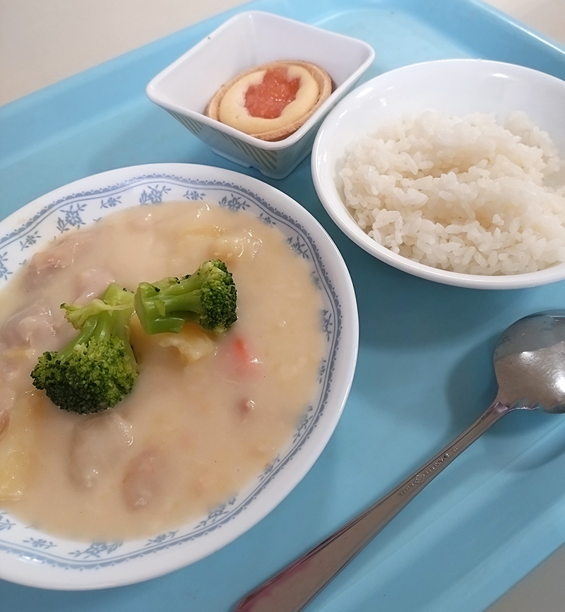 掲示されていた写真よりもルーがたっぷりでご飯が進みます🎵(職員はシチューもご飯派です!) じゃがいもと人参がゴロゴロ、鶏肉はほろほろでとっても美味しかったです。食べるだけで国際協力できるので、なんだか良いことをした気持ちになれました。 リンゴのタルトは、小麦・乳・卵不使用なので、アレルギーがある方も安心して食べられます。中心に乗っているリンゴが甘酸っぱくて食が進み、ペロリでした🍎