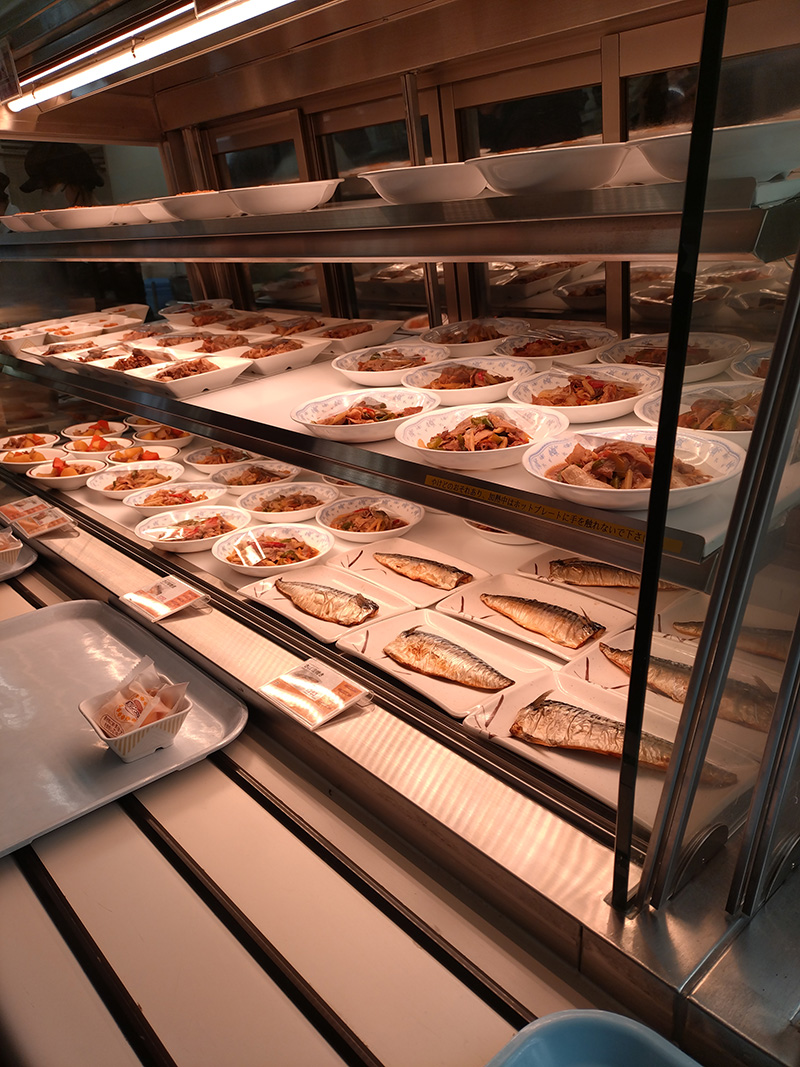 小鉢やおかずが並ぶショーケース、ご紹介したことなかったなと思い撮影してみました。カレーや丼ぶりはこの奥で口頭で注文するスタイルです。サラダやデザートは写真に写っていませんが、右側にもう一つショーケースがあり、そちらから取ります。