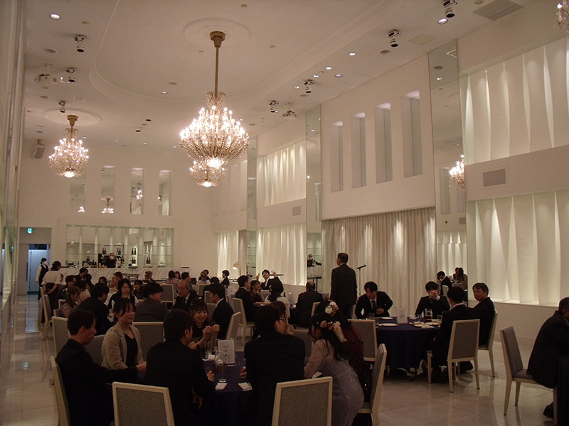 会場の様子。研究室ごとに集まって着席しました。(歓談中は、移動OKです!)